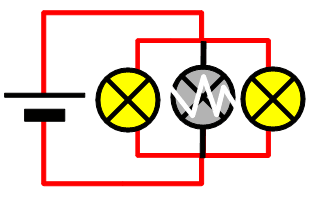 Cuando hay un trozo de cable en paralelo con algún receptor, es como si este no existiera. La electricidad tiene dos posibles caminos; uno que le cuesta un poco de trabajo, el del receptor, y otro que puede recorrer más fácilmente, el del cable, y es este último el que elige. En ese caso decimos que los elementos que están en paralelo con el trozo de cable están cortocircuitados. La electricidad se los salta. En el dibujo se ha marcado en rojo el recorrido de la corriente eléctrica.